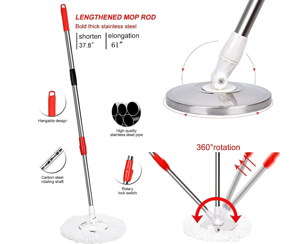 • Flexible and lightweight: The length of the mop handle can be adjusted from 37 to 61 inches, accommodating different user heights. The entire spin mop system, weighing just 4.6 lbs, is lightweight and portable, making it ideal for daily use.