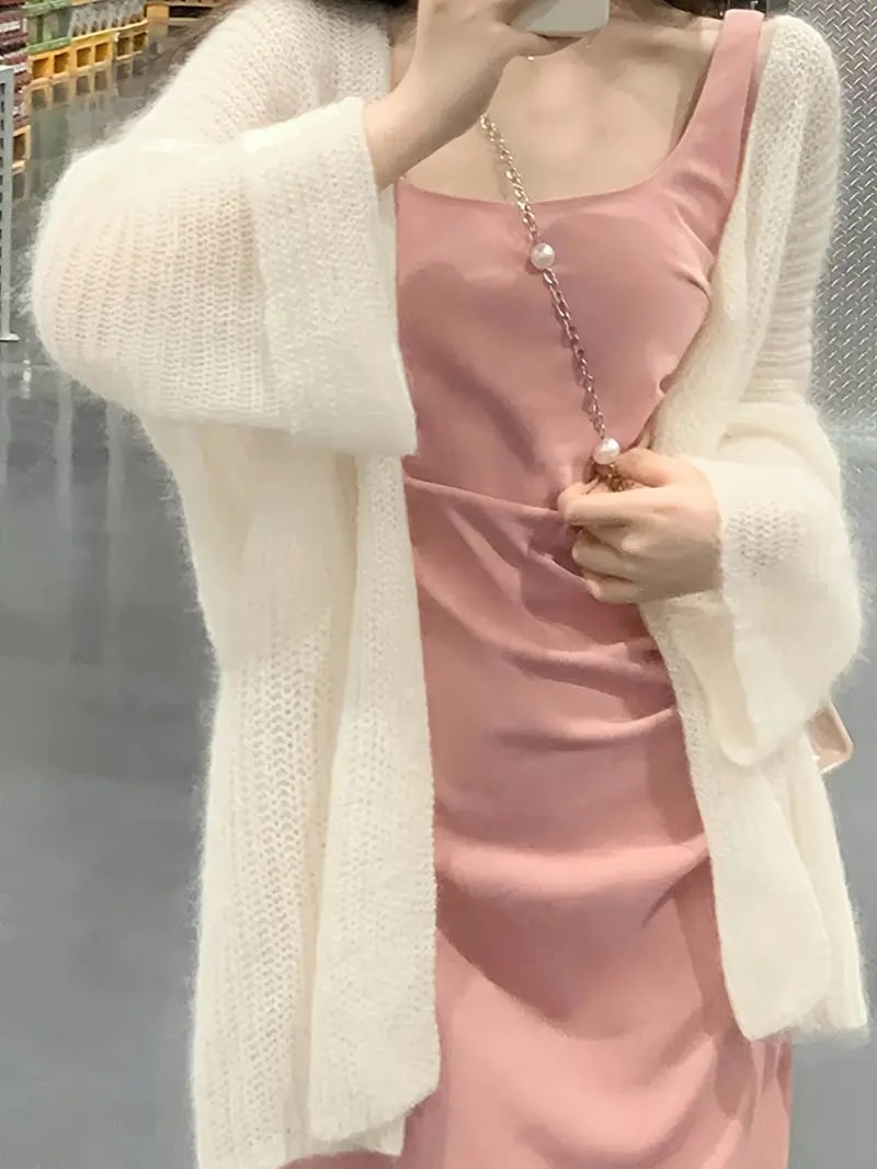 Solid Cable Knit Dress, Elegant V Neck Lantern Long Sleeve Dress, Women's Clothing